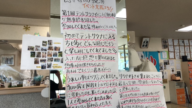 広間には、イベント告知やイベントがどうだったかのインフォーメーションが手書きで記載し