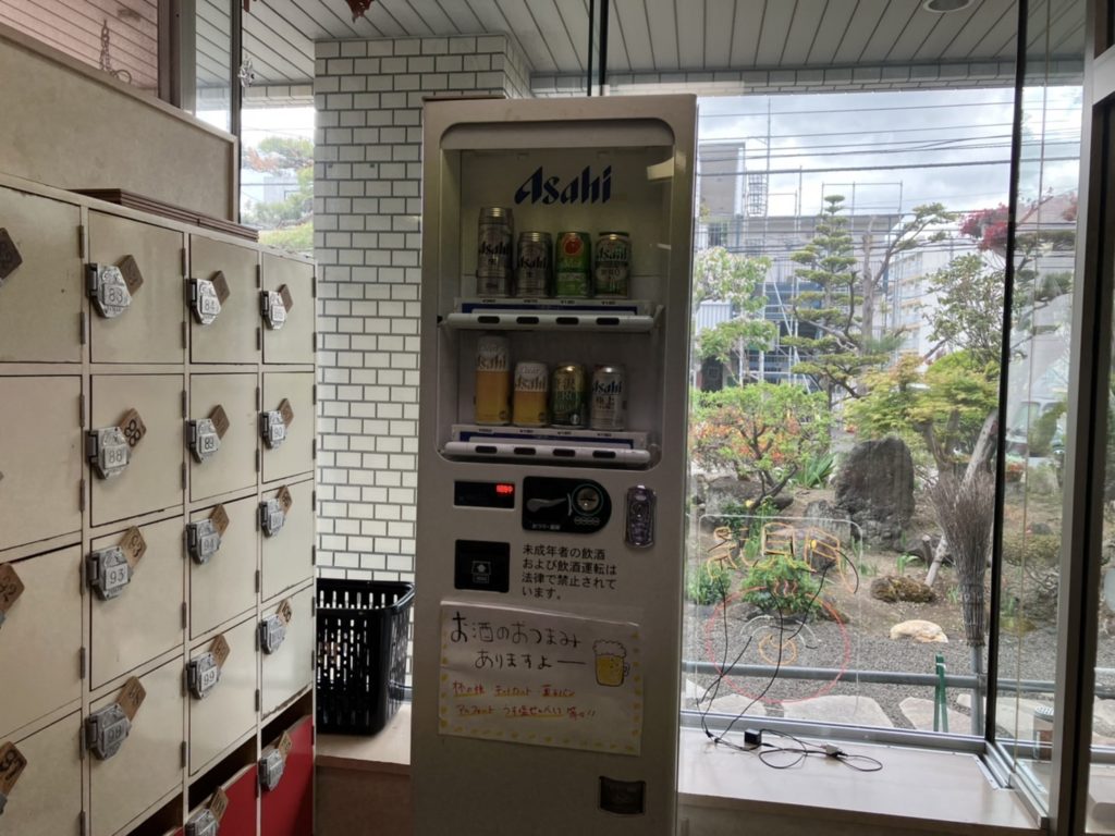 入るとまた、レトロな木鍵の下駄箱・ビールの自販機・広い喫煙所